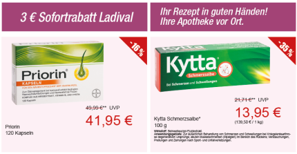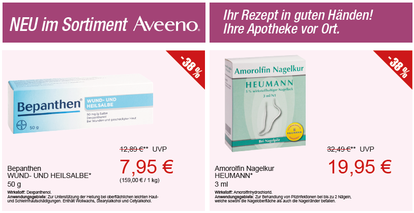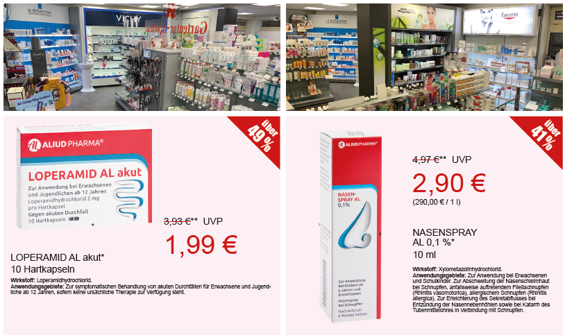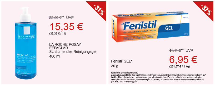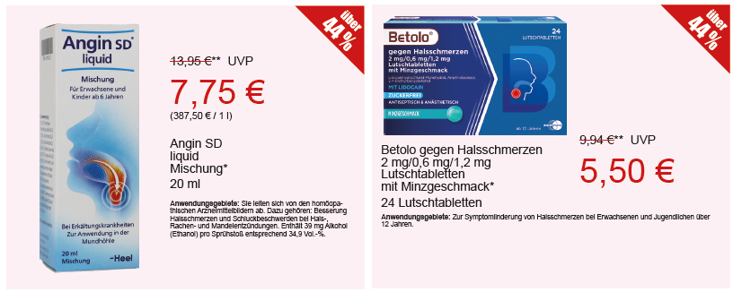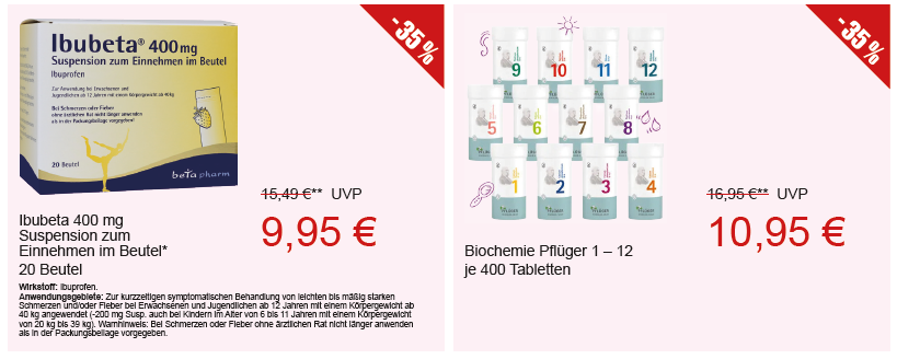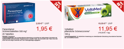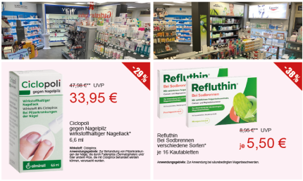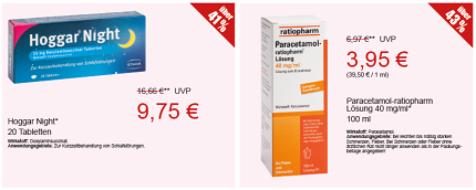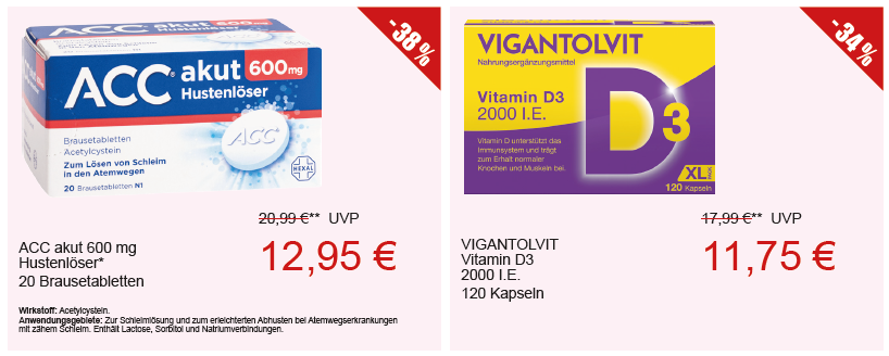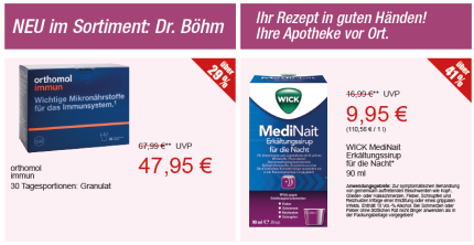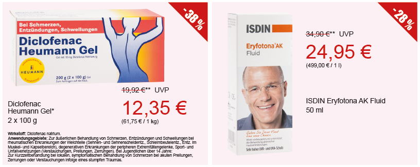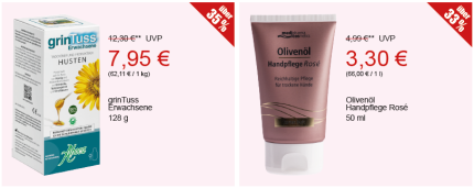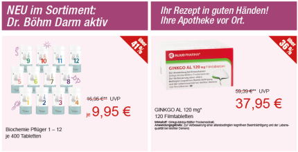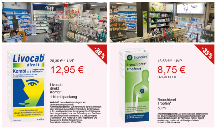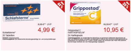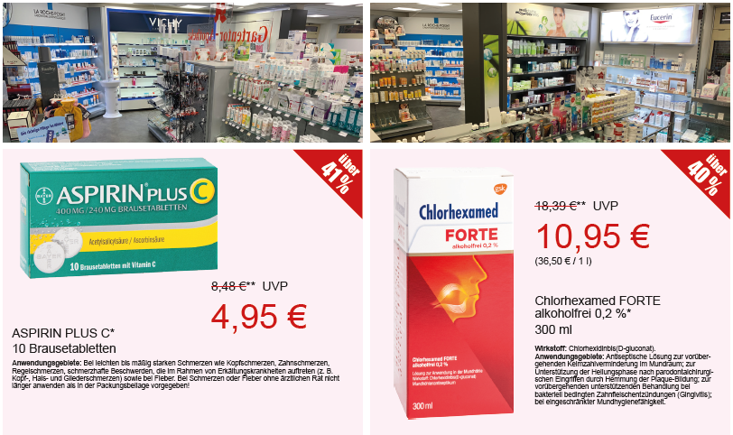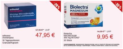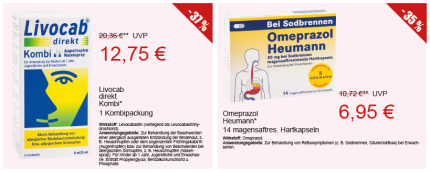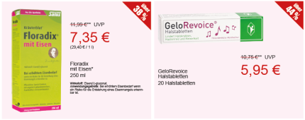 Die durchgestrichenen Preise sind die unverbindliche Preisempfehlung der Hersteller (UVP), oder die Altpreise der Apotheke.Die prozentualen Ersparnisse beziehen sich auf die UVP, oder die Altpreise der Apotheke im Verhältnis zu den Angebotspreisen der Apotheke.
